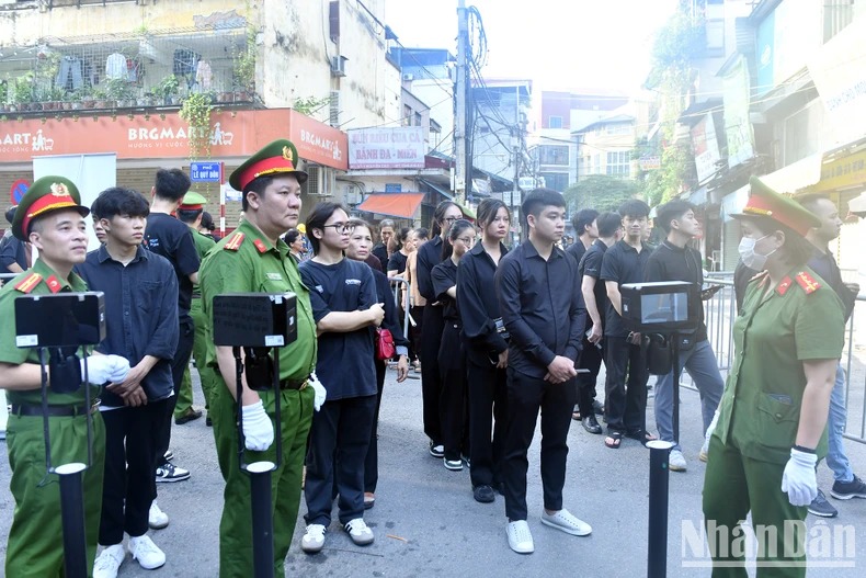 Phía trong khuôn viên nhà tang lễ, Ban Tổ chức bố trí lực lượng túc trực, hỗ trợ người dân vào viếng Tổng Bí thư Nguyễn Phú Trọng một cách trang nghiêm, thuận tiện.