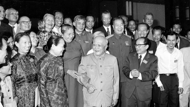 Chủ tịch Tôn Đức Thắng và các đại biểu tại Đại hội Mặt trận thống nhất Việt Nam, ngày 31/1/1977. (Ảnh TTXVN)