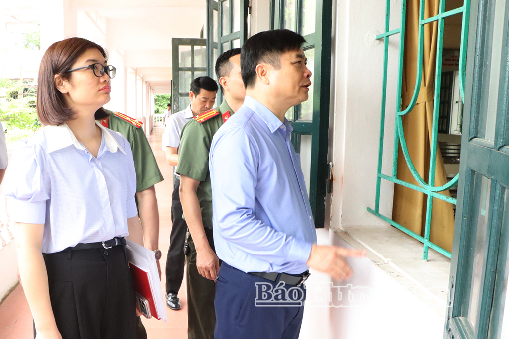 Đồng chí Phó Chủ tịch UBND tỉnh và đồng chí Giám đốc Sở Giáo dục và Đào tạo kiểm tra khu vực phòng thi tại điểm thi Trường THPT Nguyễn Đức Cảnh.