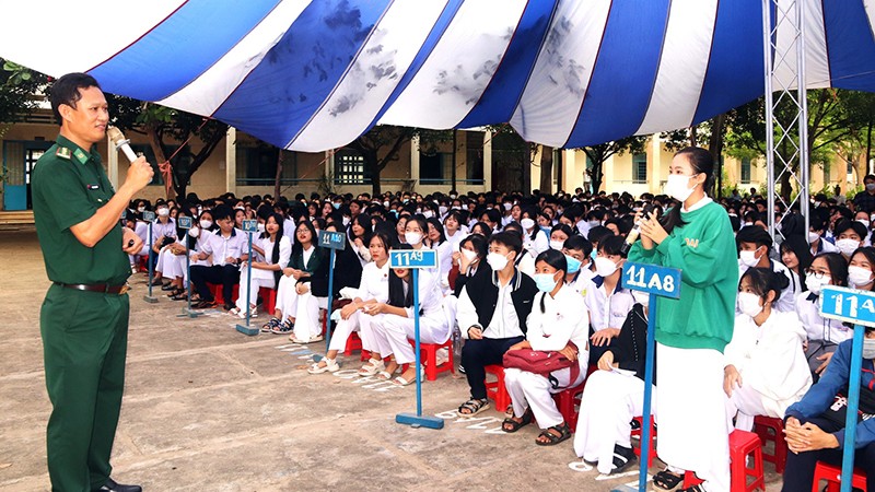 Phó Chủ nhiệm Chính trị Bộ Chỉ huy Bộ đội Biên phòng tỉnh Bình Thuận Phạm Ngọc Hòa trao đổi với học sinh về biển đảo.