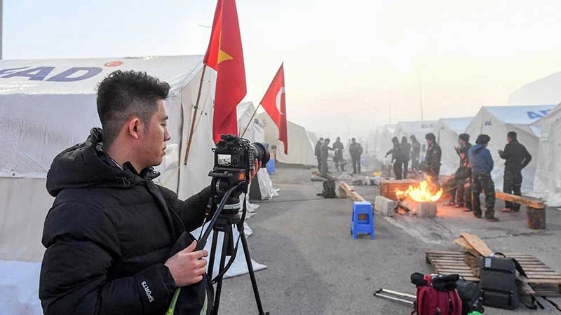 Phóng viên Báo Nhân Dân tác nghiệp tại các vùng chịu ảnh hưởng bởi động đất ở Thổ Nhĩ Kỳ. (Ảnh THÀNH ĐẠT)
