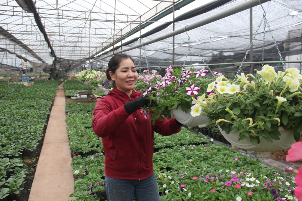 Người dân xã Xuân Quan (Văn Giang) chăm sóc hoa treo giỏ