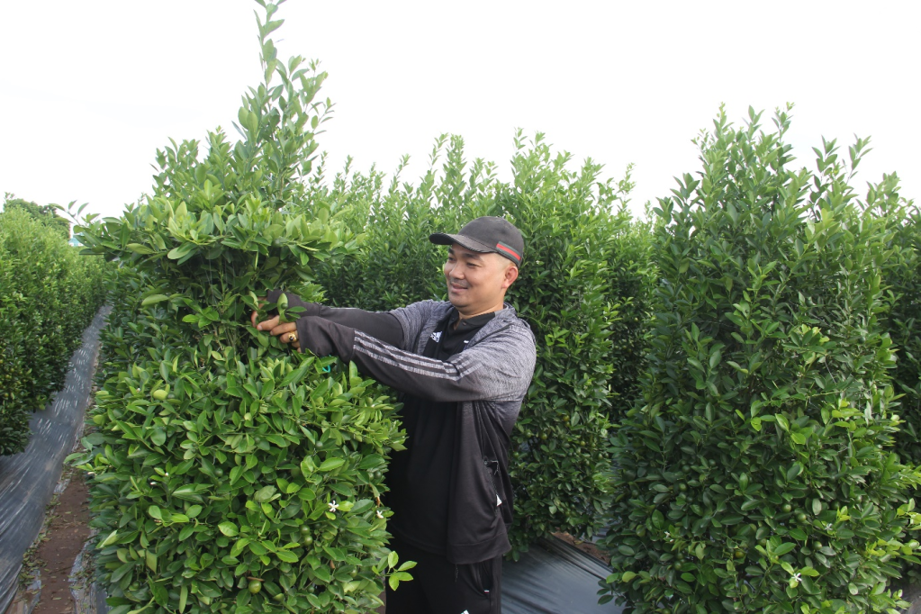 Người dân xã Đông Tảo (Khoái Châu) tạo dáng cho cây quất