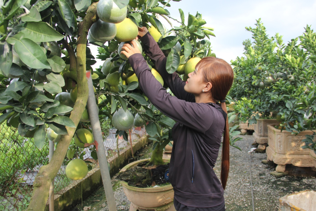 Nông dân xã Phụng Công (Văn Giang) tạo dáng cho cây