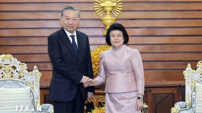 Chủ tịch nước Tô Lâm hội kiến Chủ tịch Quốc hội Campuchia Khuon Sudary. (Ảnh: TTXVN)
