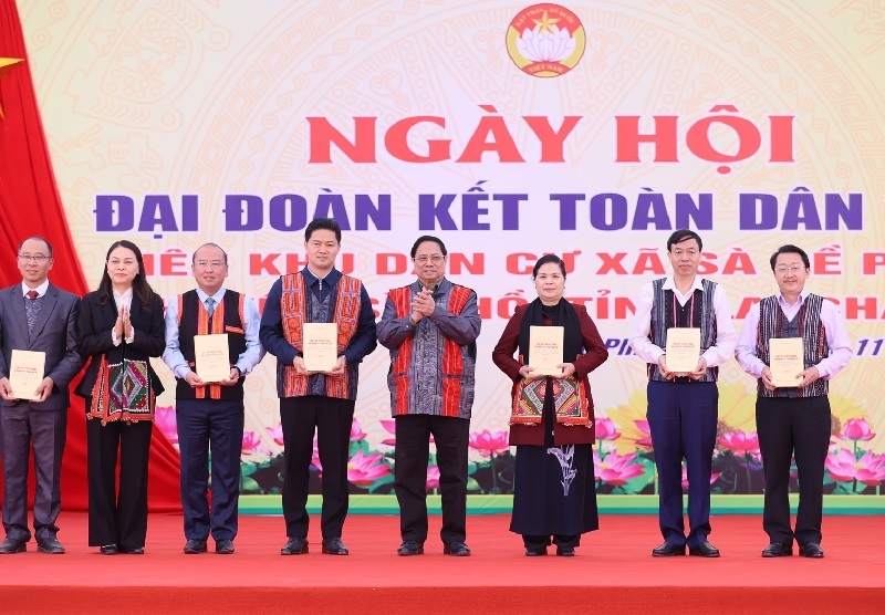Thủ tướng Phạm Minh Chính tặng cuốn sách của Tổng Bí thư Nguyễn Phú Trọng cho cán bộ và nhân dân tỉnh Lai Châu. (Ảnh: Dương Giang/TTXVN)