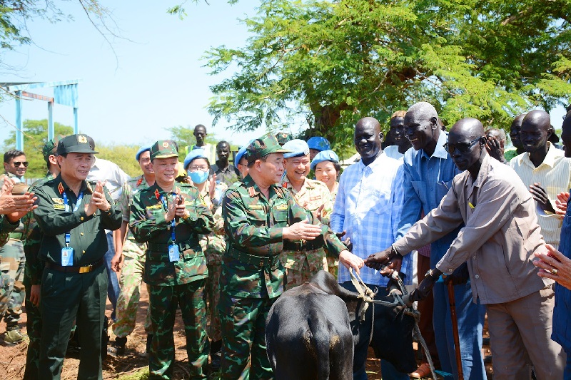 Thượng tướng Hoàng Xuân Chiến, Ủy viên Trung ương Đảng, Thứ trưởng Bộ Quốc phòng thay mặt cán bộ, chiến sĩ Đội Công binh số 1 Việt Nam tham gia hoạt động gìn giữ hòa bình Liên hợp quốc tại Abyei nhận bò từ chính quyền và nhân dân địa phương tặng _Nguồn: qdnd.vn