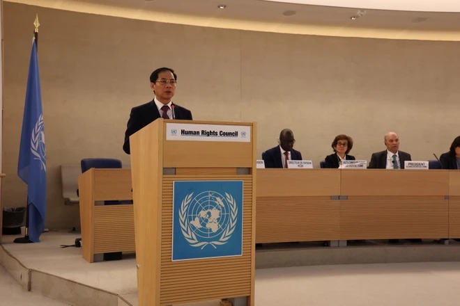 Bộ trưởng Bộ Ngoại giao Bùi Thanh Sơn phát biểu tại Phiên họp cấp cao Khóa họp thường kỳ lần thứ 55 của Hội đồng Nhân quyền Liên hợp quốc. (Ảnh: Nguyễn Anh Hiển/TTXVN)