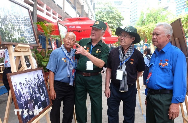 Các đại biểu xem ảnh, ôn lại kỷ niệm hào hùng một thời. (Ảnh Hương Giang/TTXVN)