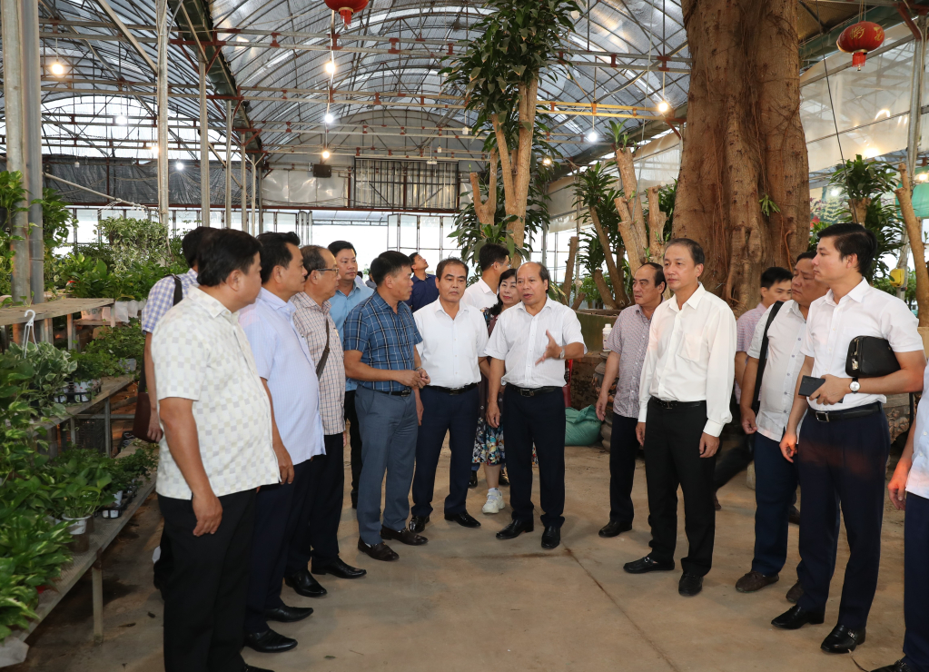 Các đại biểu thăm mô hình trồng hoa, cây cảnh ở xã Xuân Quan (Văn Giang)