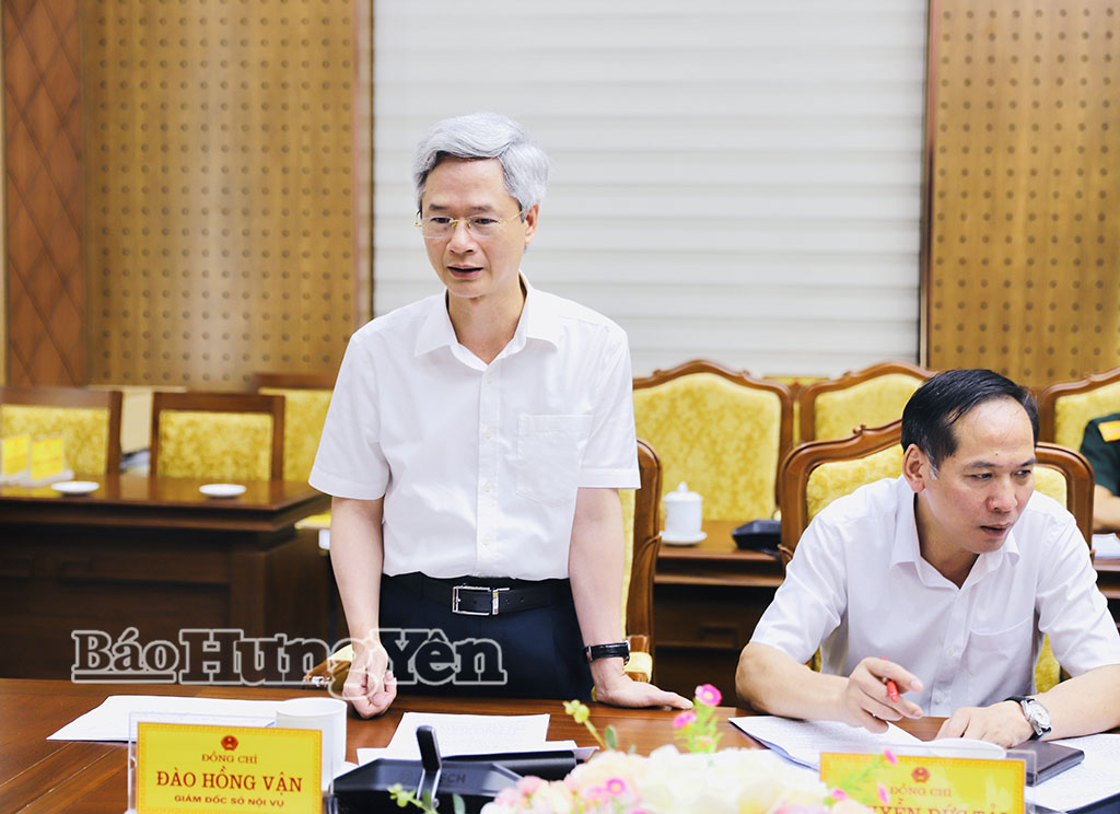 Đồng chí Đào Hồng Vận, Ủy viên Ban Thường vụ Tỉnh ủy, Giám đốc Sở Nội vụ phát biểu tại cuộc họp.