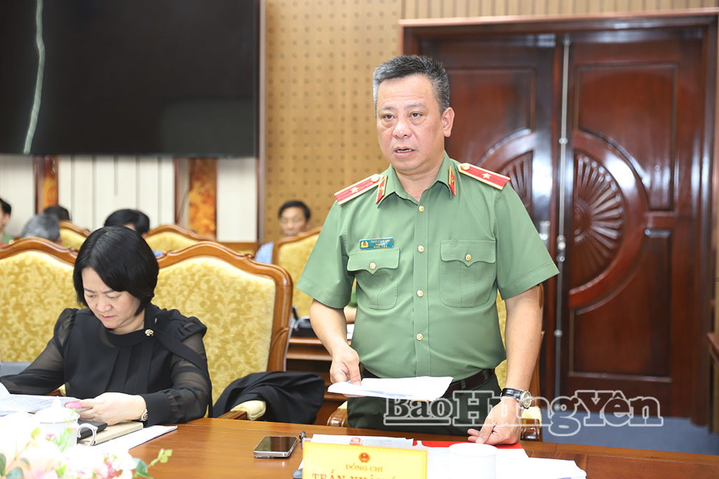 Thiếu tướng Trần Xuân Ánh, Ủy viên Ban Thường vụ Tỉnh ủy, Giám đốc Công an tỉnh phát biểu tại cuộc họp.