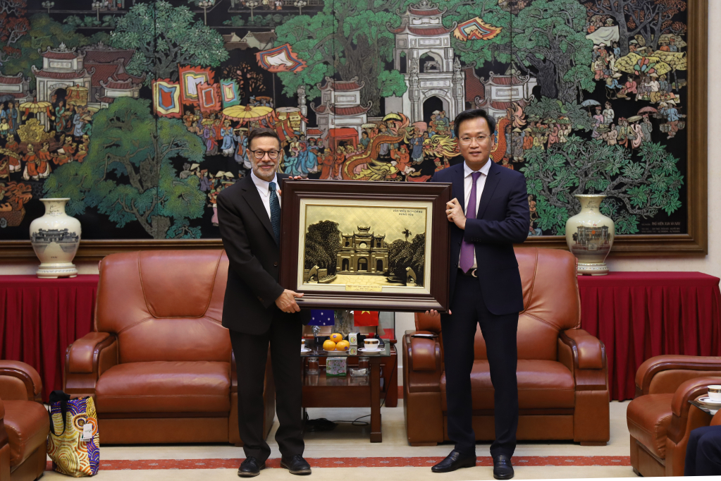 Bí thư Tỉnh ủy Nguyễn Hữu Nghĩa tặng bức tranh Văn Miếu Xích Đằng