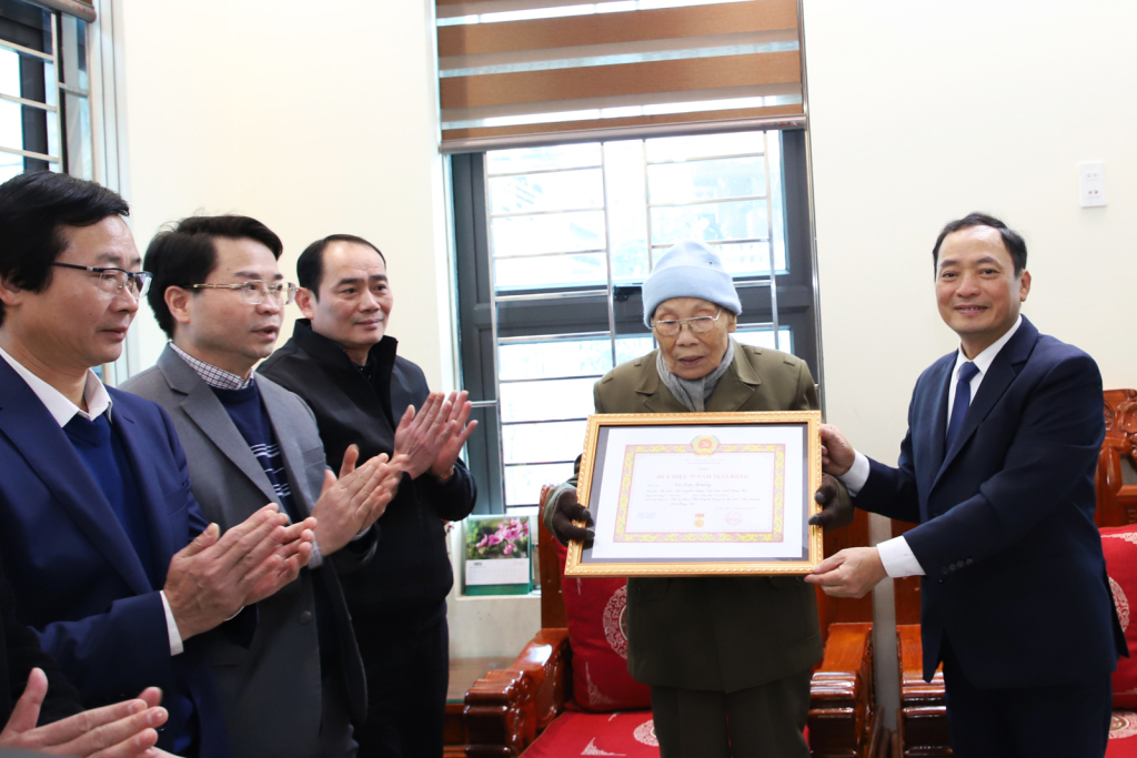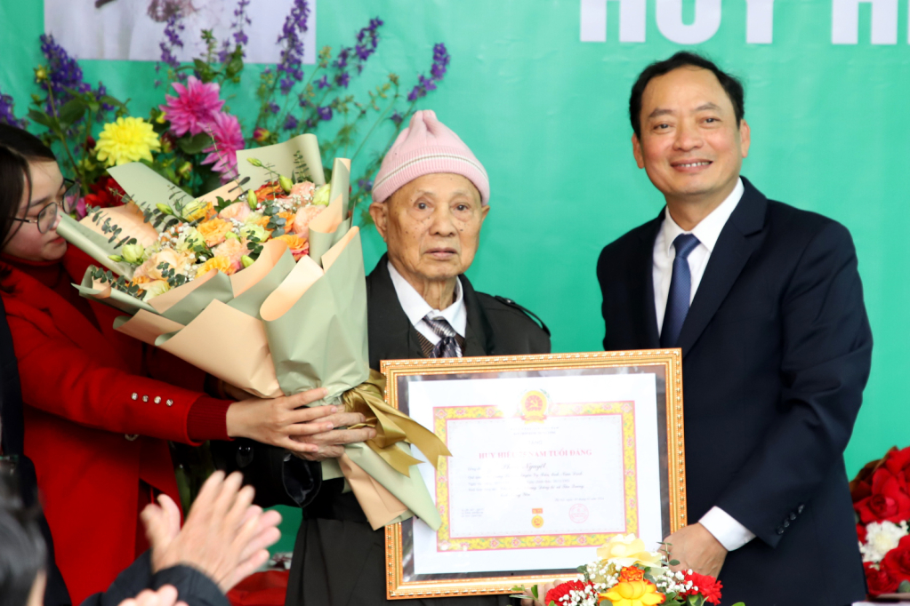 Đồng chí Trần Quốc Văn, Phó Bí thư Tỉnh ủy, Chủ tịch UBND tỉnh trao Huy hiệu 75 năm tuổi Đảng tặng đảng viên Phạm Văn Nguyệt, Chi bộ thôn Thọ Khang, Đảng bộ xã Tân Quang