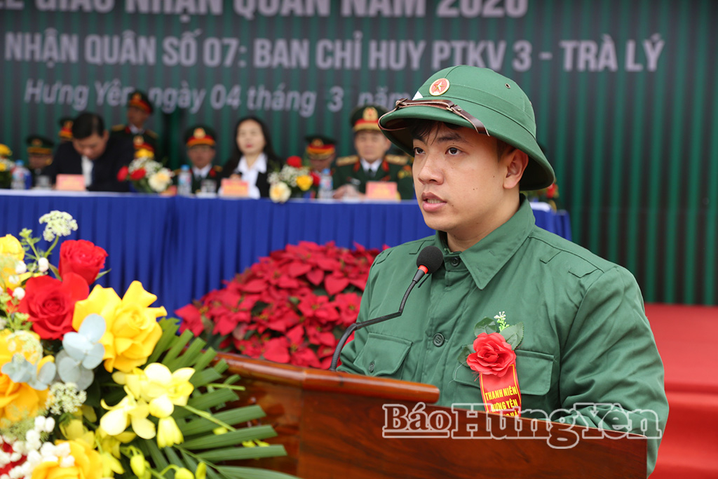 Tân binh Hà Minh Hiếu, phường Trà Lý thay mặt cho các thanh niên nhập ngũ phát biểu xin hứa tiếp tục phát huy truyền thống quê hương Hưng Yên anh hùng, tinh thần xung kích, tình nguyện của tuổi trẻ, tích cực học tập, tu dưỡng rèn luyện nâng cao bản lĩnh chính trị, hoàn thành xuất sắc mọi nhiệm vụ được giao, xứng đáng với niềm tin của cấp ủy, chính quyền và Nhân dân giao phó.