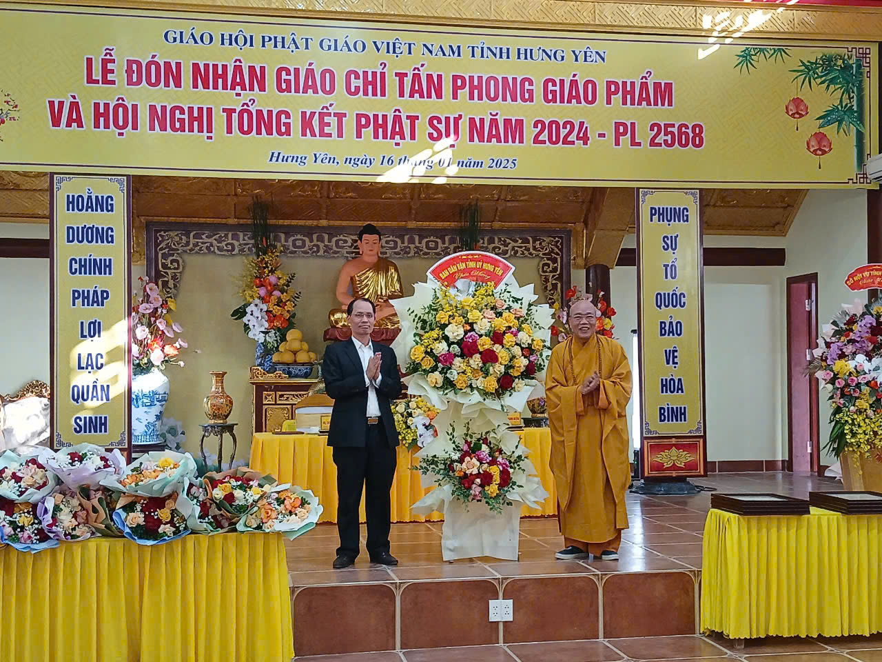 Ông Vương Quang Hưng, Phó trưởng Ban Dân vận Tỉnh ủy, Phó trưởng Ban Chỉ đạo công tác tôn giáo tỉnh tặng hoa chúc mừng