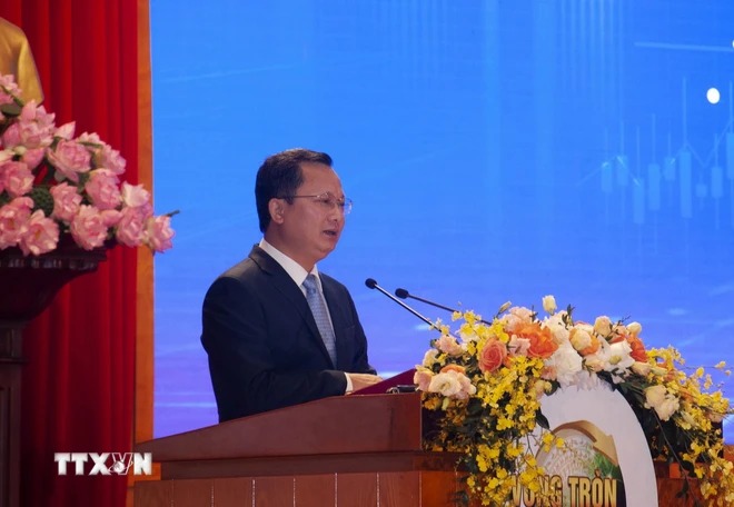 Ông Cao Tường Huy, Chủ tịch Ủy ban Nhân dân tỉnh Quảng Ninh phát biểu tại Hội nghị. (Ảnh: TTXVN phát)