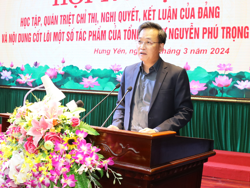 Tại hội nghị, đồng chí Bí thư Tỉnh ủy Nguyễn Hữu Nghĩa quán triệt nội dung cốt lõi một số tác phẩm của Tổng Bí thư Nguyễn Phú Trọng gồm: Bài viết "Tự hào và tin tưởng dưới lá cờ vẻ vang của Đảng, quyết tâm xây dựng một nước Việt Nam ngày càng giàu mạnh, văn minh, văn hiến và anh hùng"; cuốn sách Xây dựng và phát triển nền đối ngoại, ngoại giao Việt Nam toàn diện, hiện đại, mang đậm bản sắc “cây tre Việt Nam”.