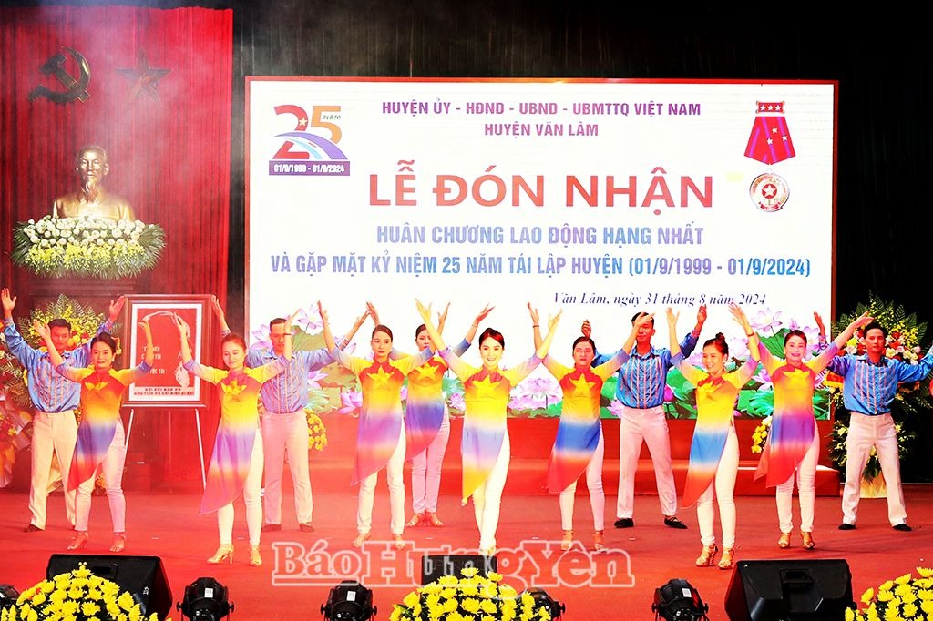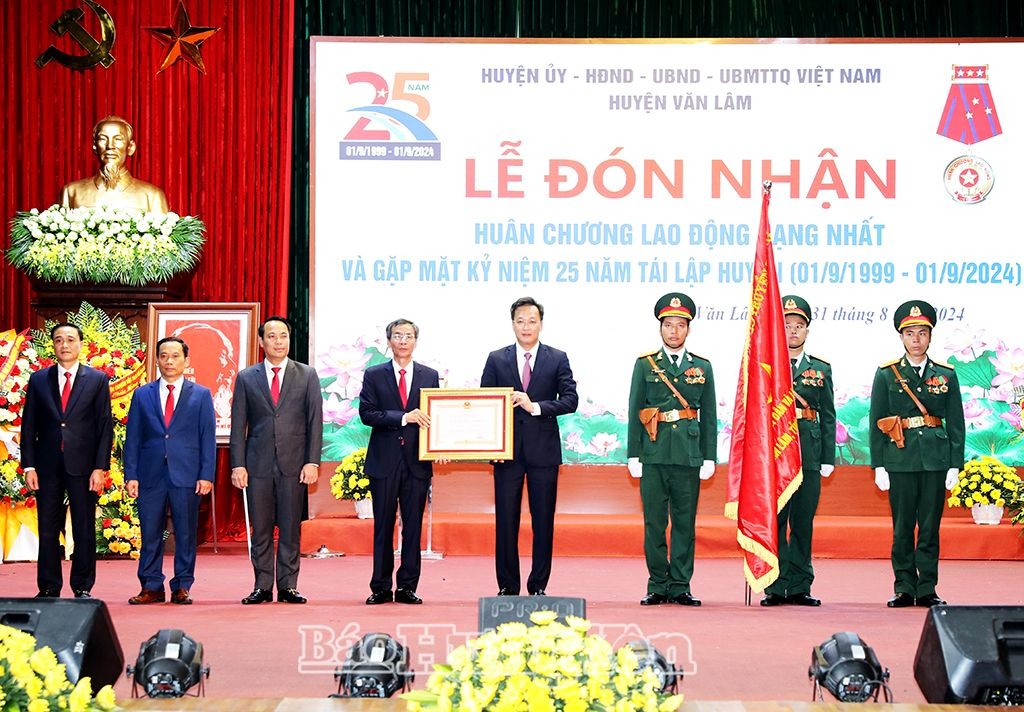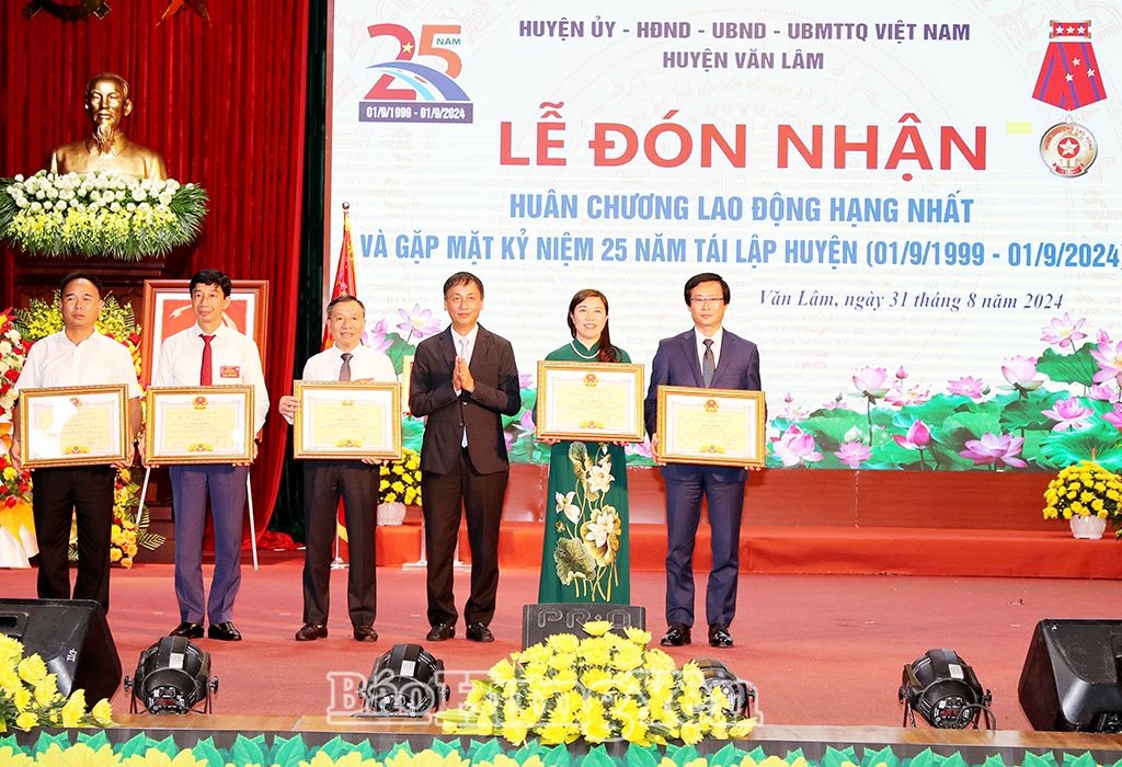 Ngày 31/8, Huyện ủy, HĐND, UBND, Ủy ban MTTQ Việt Nam huyện Văn Lâm tổ chức lễ đón nhận Huân chương Lao động hạng Nhất và gặp mặt kỷ niệm 25 năm tái lập huyện (1/9/1999 – 1/9/2024). Các đồng chí: Phạm Minh Chính, Ủy viên Bộ Chính trị, Thủ tướng Chính phủ; Võ Thị Ánh Xuân, Ủy viên BCH Trung ương Đảng, Phó Chủ tịch nước Cộng hòa Xã hội chủ nghĩa Việt Nam gửi tặng lẵng hoa chúc mừng huyện.