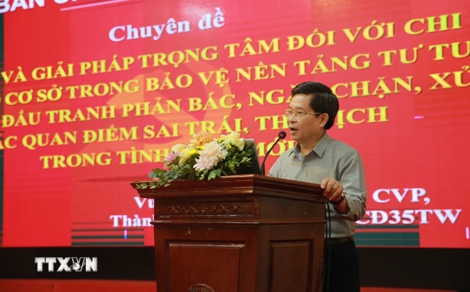 Tiến sỹ Vũ Trọng Hà, Vụ trưởng, Chánh Văn phòng Ban Chỉ đạo 35 Trung ương thông tin chuyên đề tại Lớp bồi dưỡng. (Ảnh: Diệp Trương/TTXVN)