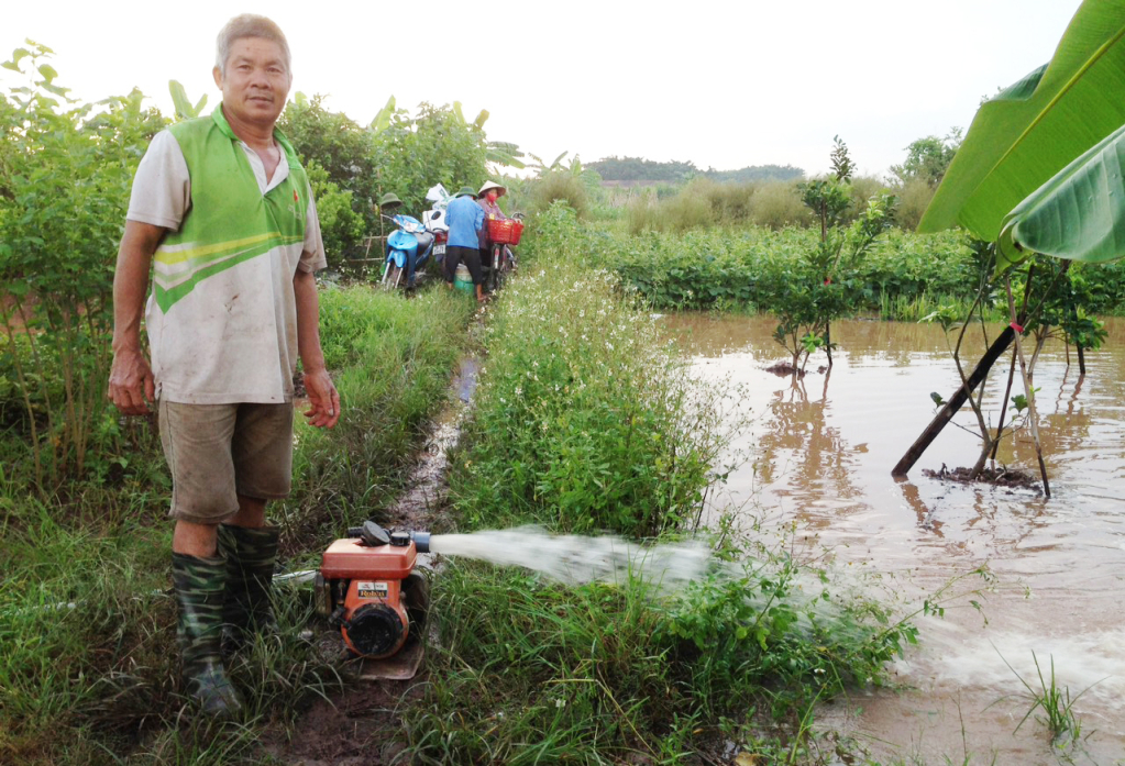 Nông dân huyện Văn Giang bơm nước chống úng cho cây ăn quả