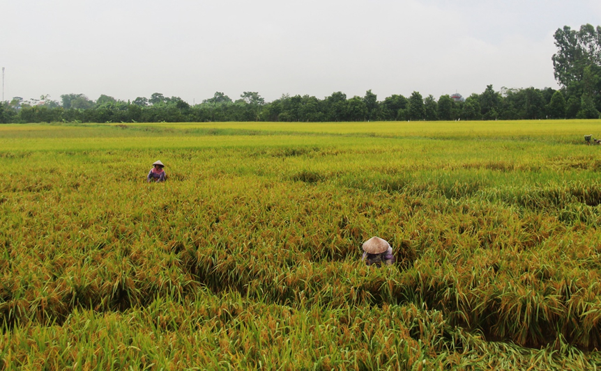 Nông dân xã Hùng An (Kim Động) dựng buộc lúa bị đổ do mưa lớn