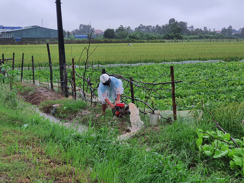 Nông dân xã Hoàn Long (Yên Mỹ) thực hiện bơm gạn tháo nước trên các diện tích rau màu phòng, chống úng ngập, bảo vệ cây trồng