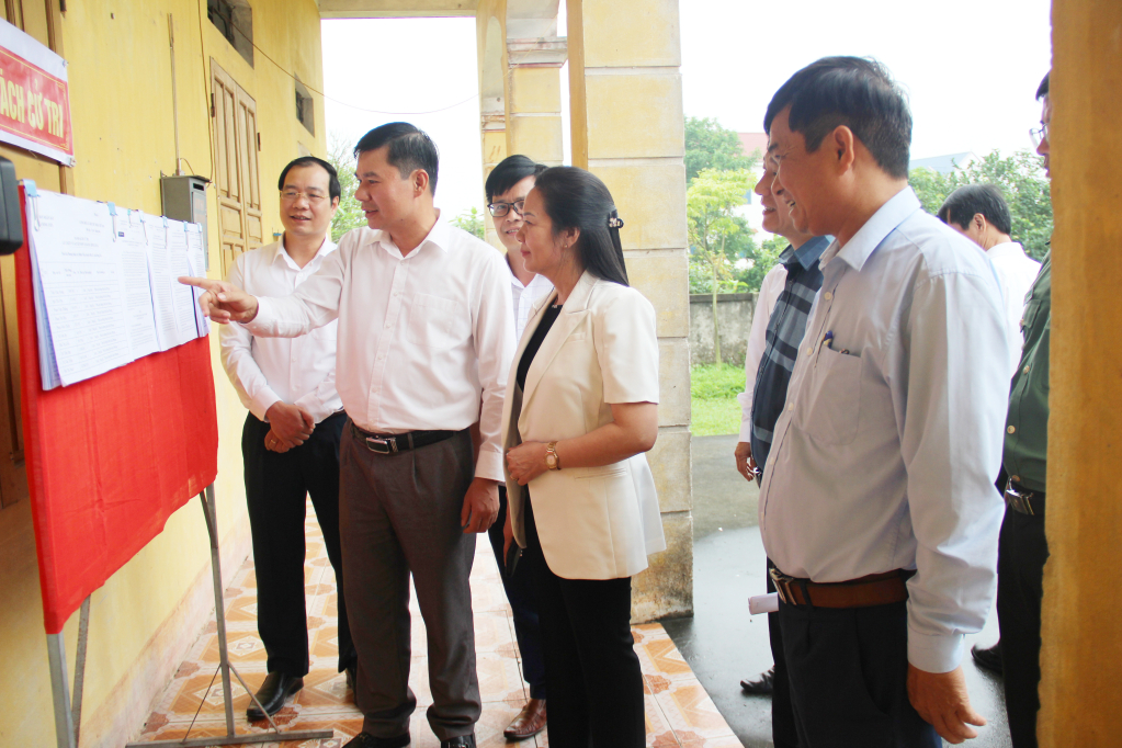 Trong chương trình, đoàn đã đến kiểm tra thực tế việc lập, niêm yết danh sách cử tri, tài liệu về sắp xếp ĐVHC cấp xã tại trụ sở UBND xã Minh Tiến, Nhà văn hóa thôn Phù Oanh (xã Minh Tiến).