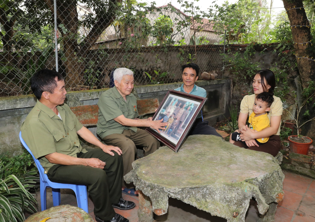 Ông Phạm Văn Điền ôn lại kỷ niệm về những người đồng đội cùng chiến đấu trong Chiến dịch Điện Biên Phủ với các thành viên trong gia đình