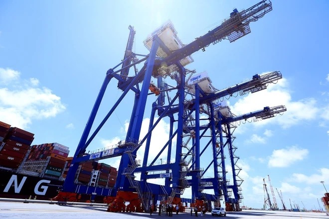 Cần trục giàn có khả năng nâng hàng chục tấn khi bốc xếp tại Tân Cảng, Lạch Huyện, Hải Phòng. (Ảnh: Tuấn Anh/TTXVN)