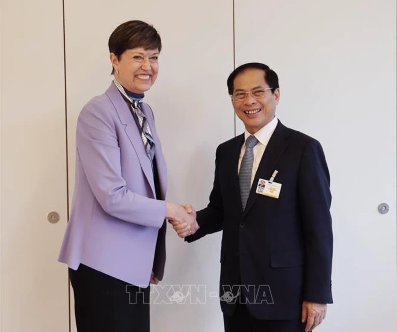 Bộ trưởng Ngoại giao Bùi Thanh Sơn và Đại diện Bộ trưởng Ngoại giao Canada tại Quốc hội Pam Damoff. Ảnh: TTXVN