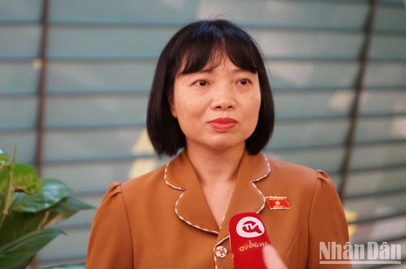Đại biểu Nguyễn Thị Việt Nga (Hải Dương) chia sẻ với phóng viên bên hành lang Quốc hội. (Ảnh: TRUNG HƯNG)