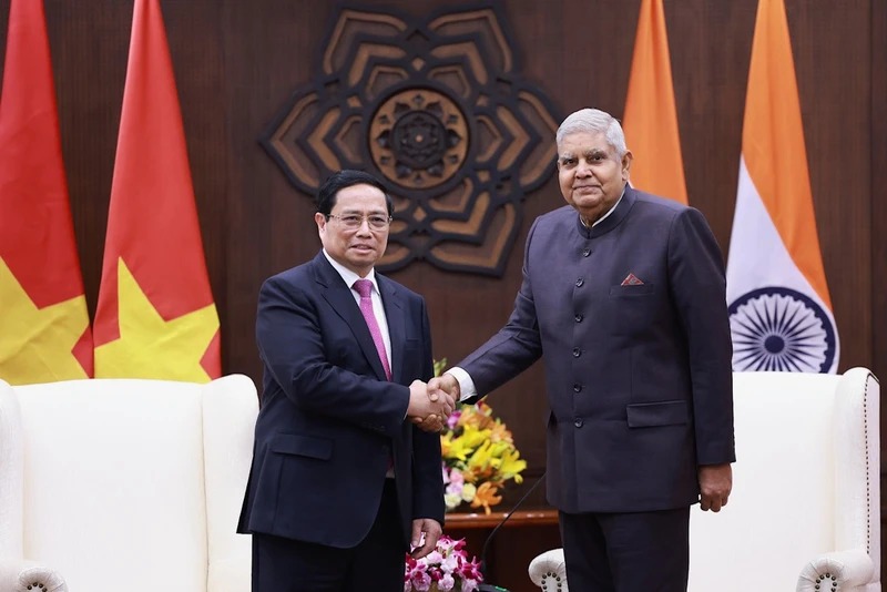 Thủ tướng Chính phủ Phạm Minh Chính đã hội kiến Phó Tổng thống, Chủ tịch Thượng viện Ấn Độ Jagdeep Dhankhar. (Ảnh: DƯƠNG GIANG)
