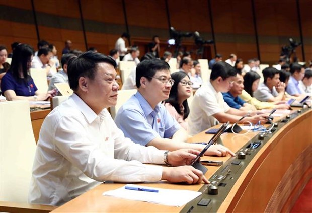 Các đại biểu Quốc hội biểu quyết thông qua nghị quyết về Chương trình xây dựng luật, pháp lệnh năm 2024, điều chỉnh Chương trình xây dựng luật, pháp lệnh năm 2023. (Ảnh: Phạm Kiên/TTXVN)