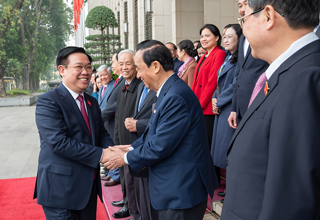 Ủy viên Bộ Chính trị, Chủ tịch Quốc hội Vương Đình Huệ với các đại biểu dự Hội nghị tổng kết công tác phối hợp giữa Ủy ban Thường vụ Quốc hội và Đoàn Chủ tịch Mặt trận Tổ quốc Việt Nam _Ảnh: TTXVN