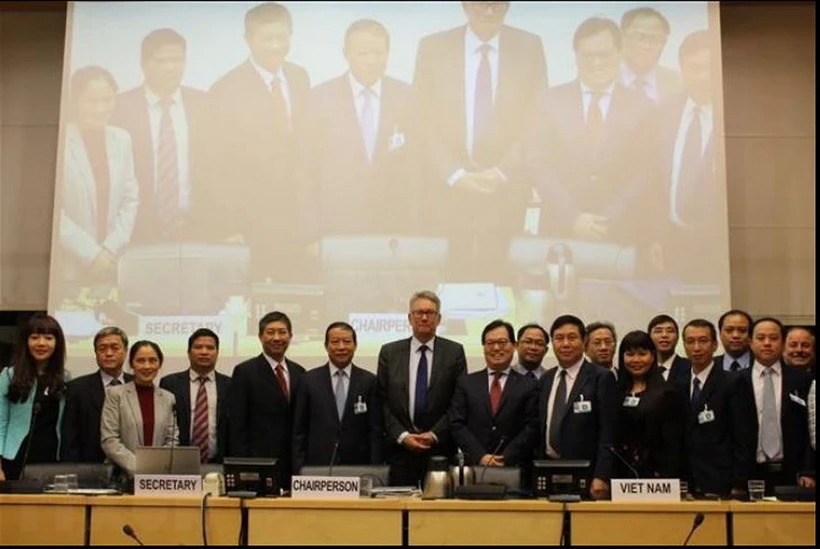 Đoàn công tác liên ngành của Việt Nam tham gia trình bày và trao đổi về Báo cáo quốc gia lần thứ nhất về thực thi Công ước Chống tra tấn tại Geneva, Thụy Sĩ. (Ảnh: Hoàng Hoa/TTXVN)