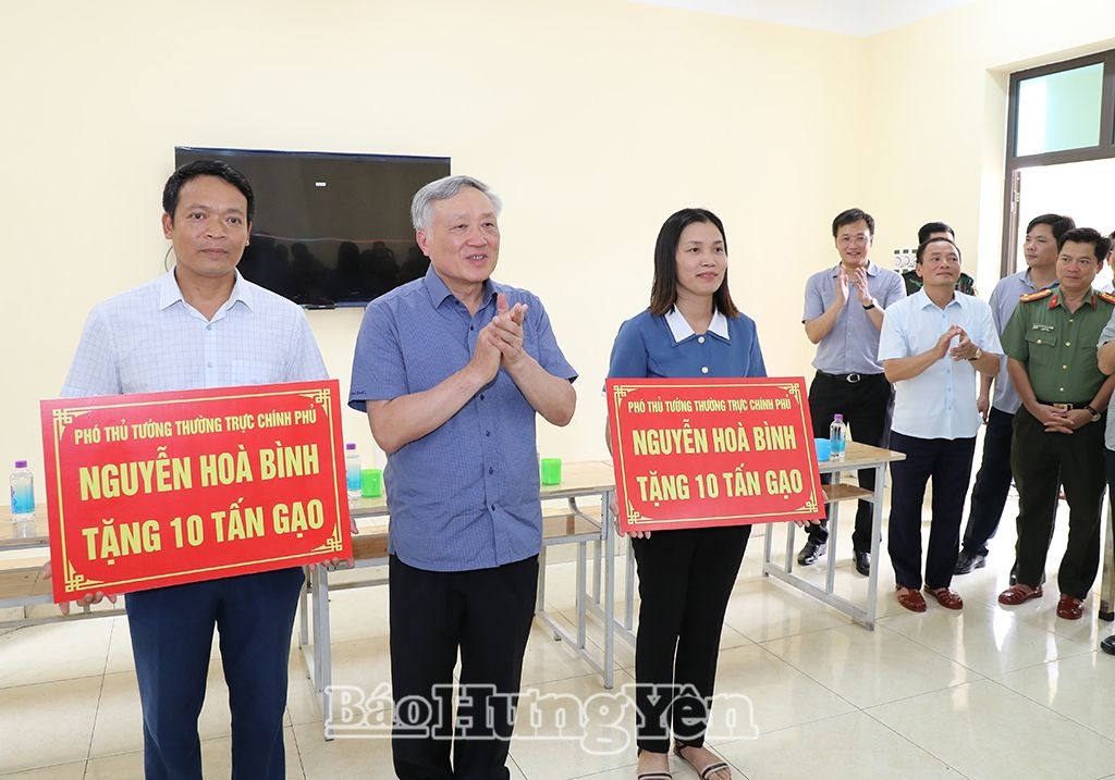 Đến thăm, động viên và tặng quà các hộ dân bị ảnh hưởng bởi mưa lũ tại xã Hùng Cường và các hộ dân đang sơ tán tại trường Cao đẳng Cộng đồng Hưng Yên (thành phố Hưng Yên), Phó Thủ tướng Thường trực Chính phủ Nguyễn Hòa Bình chia sẻ với những khó khăn, thiệt hại về tài sản của Nhân dân, mong bà con chấp hành nghiêm theo chỉ đạo của chính quyền địa phương, sớm ổn định cuộc sống. Nhân dịp này, Phó Thủ tướng Thường trực Chính phủ Nguyễn Hòa Bình trao tặng người dân 2 xã: Hùng Cường và Phú Cường (thành phố Hưng Yên), mỗi địa phương 10 tấn gạo.