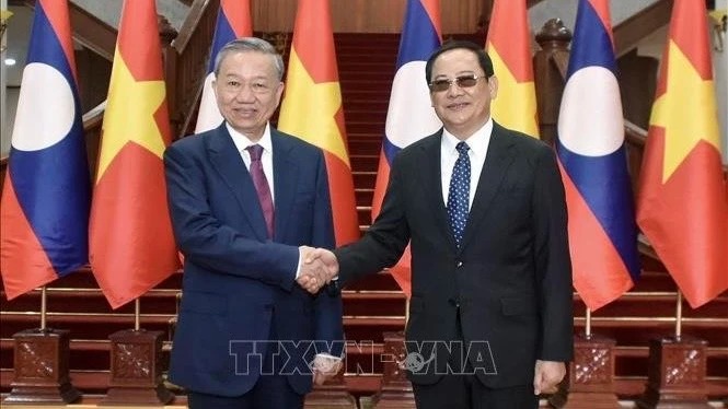 Chủ tịch nước Tô Lâm hội kiến Thủ tướng Lào Sonexay Siphandone. Ảnh: TTXVN.