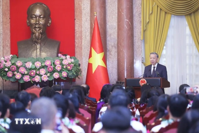 Tổng Bí thư, Chủ tịch nước Tô Lâm với đại biểu được tôn vinh trong phong trào thi đua 'tham mưu giỏi, phục vụ tốt' giai đoạn 2019-2024. (Ảnh: Lâm Khánh/TTXVN)