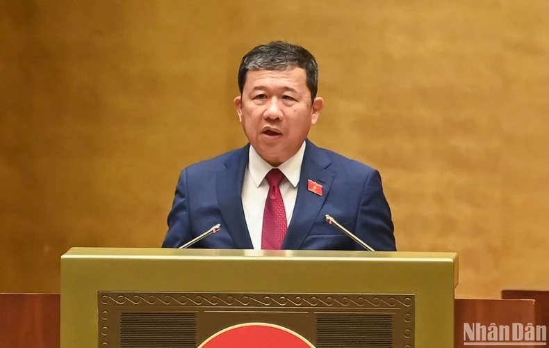 Chủ nhiệm Ủy ban Đối ngoại Vũ Hải Hà báo cáo giải trình, tiếp thu, chỉnh lý dự thảo Nghị quyết trước khi Quốc hội bấm nút thông qua. (Ảnh: DUY LINH)