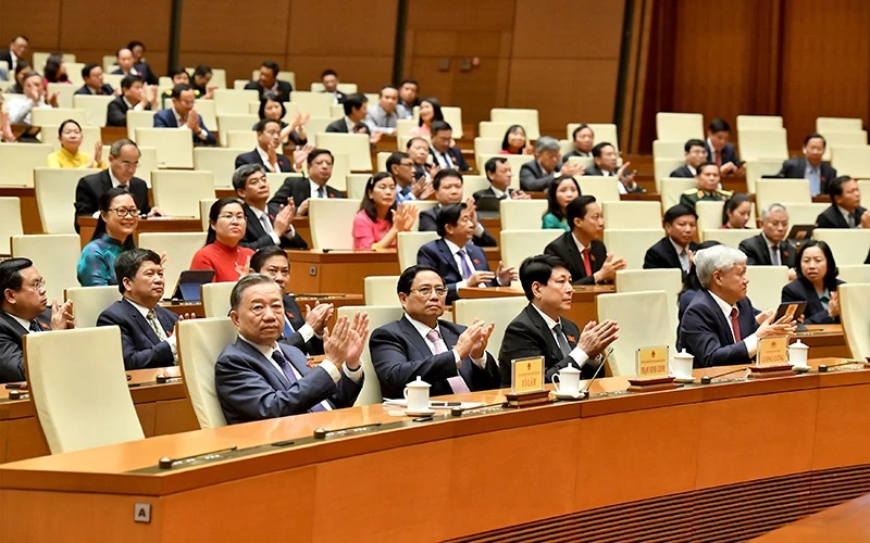 Các đồng chí lãnh đạo Đảng, Nhà nước, Quốc hội và các đại biểu tại phiên bế mạc. (Ảnh THỦY NGUYÊN)