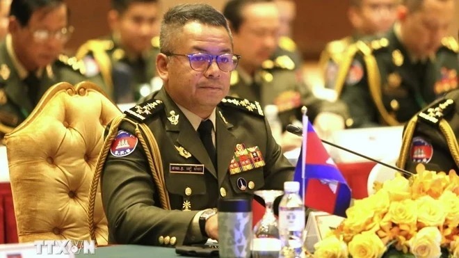 Phó Thủ tướng, Bộ trưởng Quốc phòng Campuchia Tea Seiha phát biểu tại cuộc gặp. (Ảnh: Hoàng Minh/TTXVN)