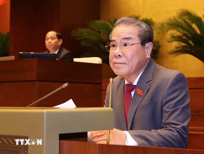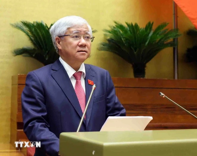 Chủ tịch Ủy ban Trung ương Mặt trận Tổ quốc Việt Nam Đỗ Văn Chiến trình bày Báo cáo tổng hợp ý kiến, kiến nghị của cử tri và Nhân dân gửi đến Kỳ họp thứ 7, Quốc hội khóa XV. (Ảnh: TTXVN)