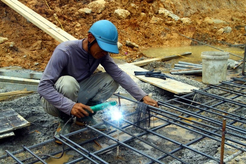 Công nhân làm việc xuyên Tết tại một dự án giao thông. (Ảnh: Tá Chuyên/TTXVN)