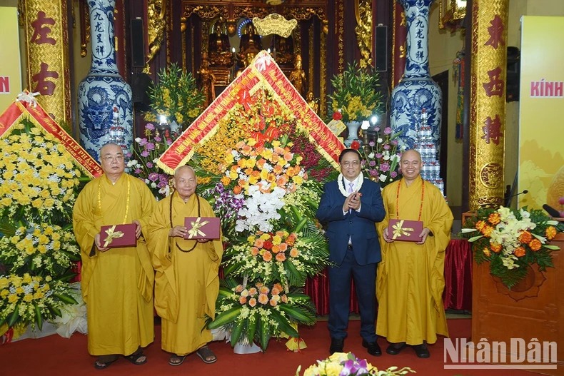 Thủ tướng Phạm Minh Chính tặng hoa và quà lưu niệm chúc mừng Trung ương Giáo hội Phật giáo Việt Nam.