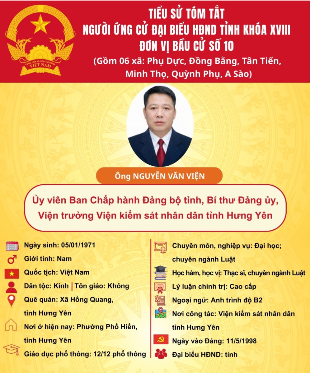 TIỂU SỬ VÀ CHƯƠNG TRÌNH HÀNH ĐỘNG CỦA ỨNG CỬ VIÊN ĐẠI BIỂU HĐND TỈNH KHÓA XVIII TẠI ĐƠN VỊ BẦU CỬ SỐ 10: ÔNG NGUYỄN VĂN VIỆN