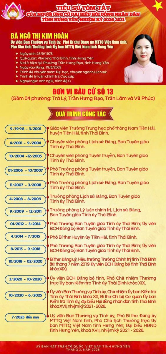 TIỂU SỬ VÀ CHƯƠNG TRÌNH HÀNH ĐỘNG CỦA ỨNG CỬ VIÊN ĐẠI BIỂU HĐND TỈNH KHÓA XVIII TẠI ĐƠN VỊ BẦU CỬ SỐ 13: NGÔ THỊ KIM HOÀN