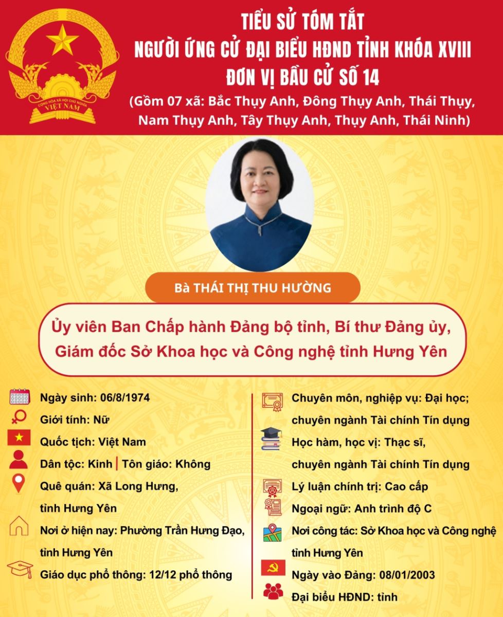 TIỂU SỬ VÀ CHƯƠNG TRÌNH HÀNH ĐỘNG CỦA ỨNG CỬ VIÊN ĐẠI BIỂU HĐND TỈNH KHÓA XVIII TẠI ĐƠN VỊ BẦU CỬ SỐ 14: BÀ THÁI THỊ THU HƯỜNG