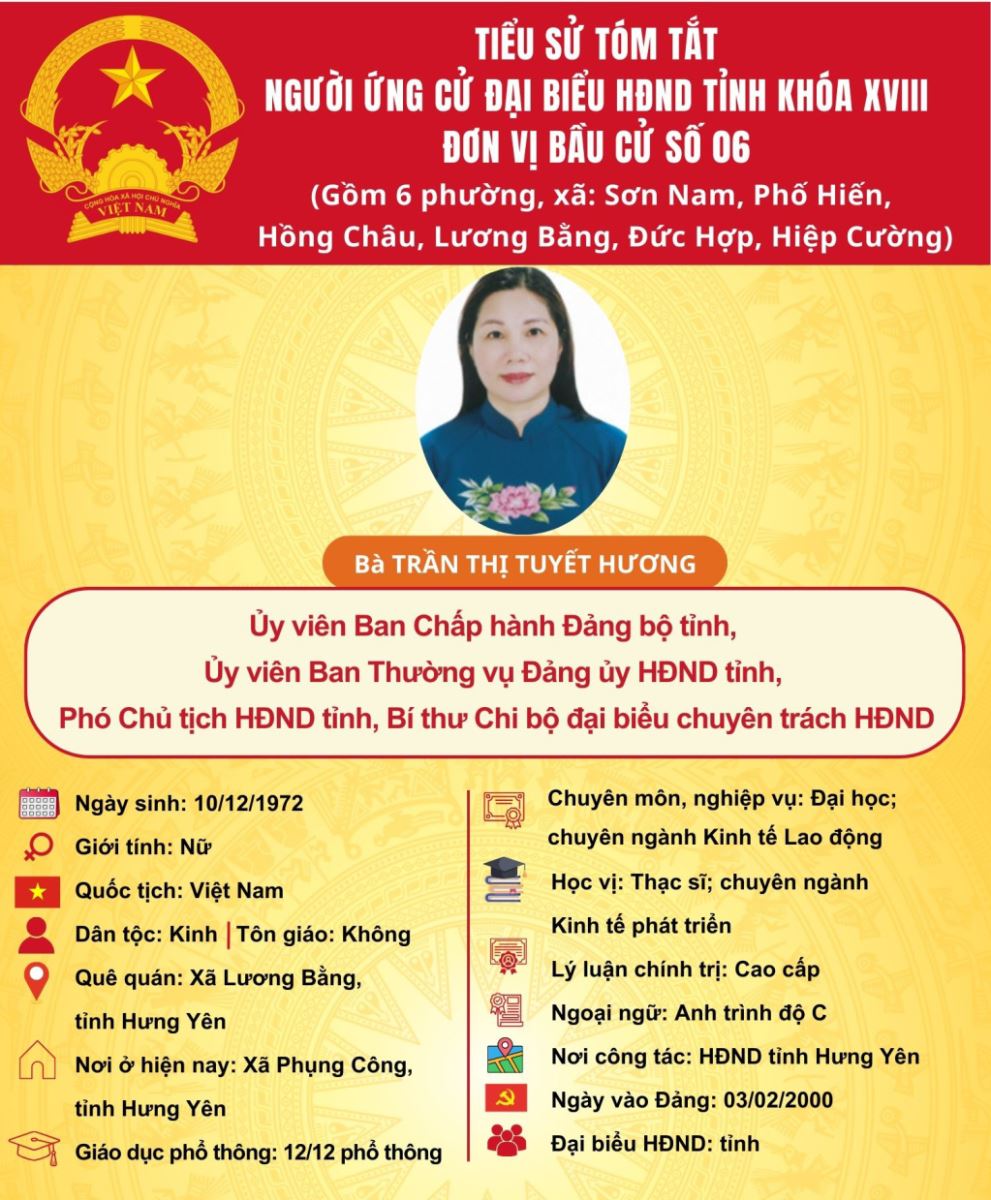 TIỂU SỬ VÀ CHƯƠNG TRÌNH HÀNH ĐỘNG CỦA ỨNG CỬ VIÊN ĐẠI BIỂU HĐND TỈNH KHÓA XVIII TẠI ĐƠN VỊ BẦU CỬ SỐ 6: BÀ TRẦN THỊ TUYẾT HƯƠNG