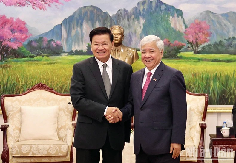 Tổng Bí thư, Chủ tịch nước Lào Thongloun Sisoulith tiếp thân mật đoàn đại biểu Ủy ban trung ương Mặt trận Tổ quốc Việt Nam. (Ảnh: Trịnh Dũng)